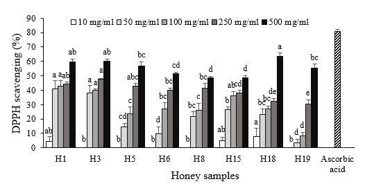Figure 1. Antioxidant activity of honey samples at various concentrations. Different letters above the columns indicate significant differences (P<0.05) among the honey samples for the related concentration. Honey samples codes: H1 (Ziziphus spina-christi), H3 (Multifloral), H5 (Glycyrrhiza glabra), H6 (Citrus), H8 (Astragalus), H15 (Quercus brantii), H18 (Fraxinus excelsior), H19 (Astragalus-Euphorbia).